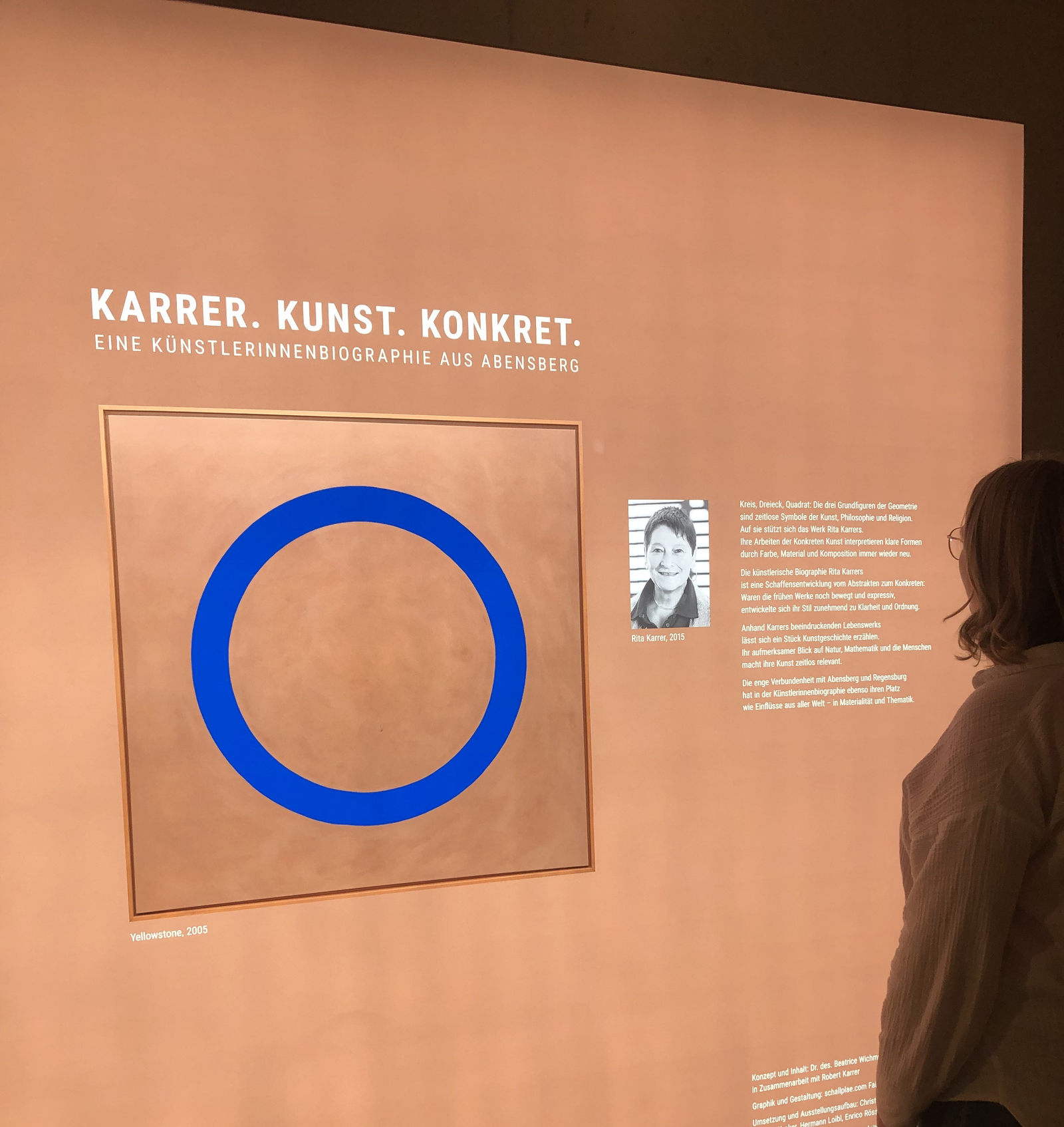 Die Sonderausstellung im Stadtmuseum Abensberg, konzipiert von Museumsleiterin Dr. des. Beatrice Wichmann in Zusammenarbeit mit Robert Karrer, dem Ehemann der Künstlerin, präsentiert Werke aus sämtlichen Schaffensphasen der gebürtigen Abensbergerin Rita Karrer, die zwar in Regensburg lebte und wirkte, aber stets eng mit ihrer Heimat verbunden blieb. Bereits in ihrer Schulzeit fiel das zeichnerische Talent von Rita Karrer, geb. Wankerl, auf, wie Schulhefte und frühe Skizzen bezeugen. Von anfänglich scheinbar ungeordneten und wilden Kompositionen entwickelte sich ihre Kunst zunehmend in Richtung des Konkreten. Kreis, Dreieck und Quadrat – die drei Grundformen der Geometrie – wurden zum zentralen Ausdrucksmittel ihrer Kunst, mit der sie die Sprache der Natur übersetzte und das Unsichtbare sichtbar machte. Karrers Kunst ist von Einflüssen aus Architektur, Natur und Poesie geprägt. Ein besonderes Schlüsselerlebnis war ihre Reise in die USA: Im Jahr 1996 erhielt Karrer ein Stipendium und verbrachte vier Wochen in einer Künstlerkolonie in Virginia, wo sie mit Musikern, Malern und Schriftstellern zusammenarbeitete. Dort entdeckte sie auch das Malen mit Erde, eine Technik, die sie fortan in vielen ihrer Werke einsetzte.