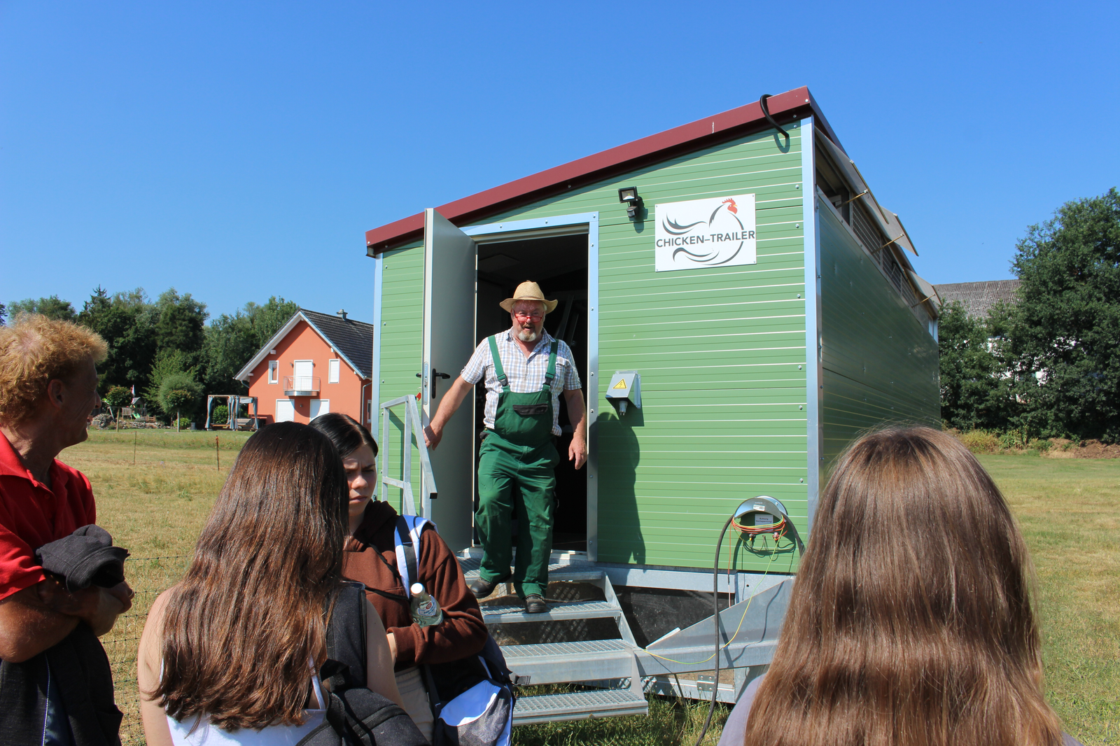 Natürlich kamen die kleinen, flauschigen Küken bei vielen Schülerinnen und Schülern am besten an. „Fast jede und jeder wollte mal eins in der Hand halten“, so die Klassenlehrer Thomas Nöth und Jonathan Furch, die mit der 6b und 6c zu Besuch waren. Das Geflügel kommt als Eintagsküken von einer Biobrüterei nach Dürnhart. In den ersten Tagen benötigen die Küken viel Wärme und Fürsorge. Ab der siebten Woche können sich die Tiere auf der Weide frei bewegen und können so Picken und Scharren. Sie fressen frische Kräuter, Insekten und Würmer und haben so einen artgerechten Lebensraum. Auch die Biohähnchen haben es besser als der Durchschnitt - Bäuml: „Ein Bio-Hähnchen bekommt Zeit zum Wachsen. Erst nach 70 bis 90 Tagen hat es sein Schlachtalter erreicht.“ Ein konventionelles Hähnchen hat 32 Tage Zeit.