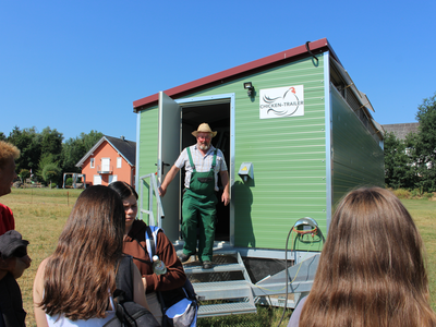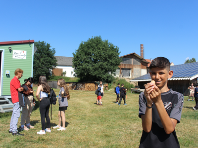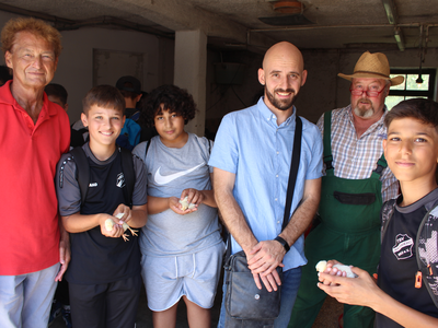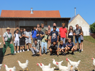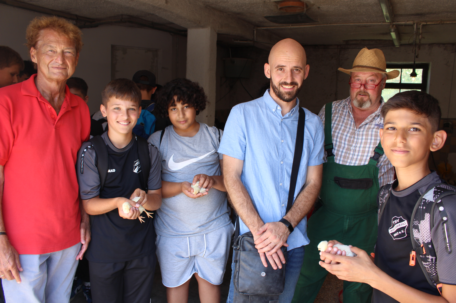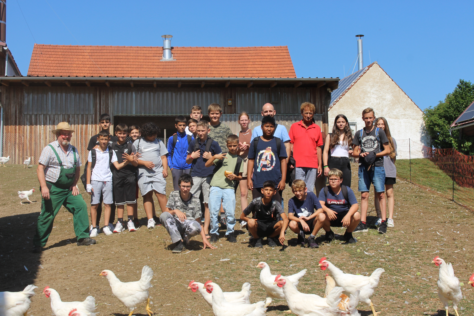 Die sechsten Klassen der Aventinus Mittelschule Abensberg haben in den Wochen vor den Sommerferien besondere Ausflüge erlebt – sie wanderten morgens zum Biohof von Hermann Bäuml nach Biburg-Dürnhart, um sich dort von dem Biolandwirt über den Hof führen zu lassen. Bäumls landwirtschaftliches Anwesen beherbergt Räume für die Aufzucht von Küken und große Freiflächen mit neuem Mobilstall für Legehennen. Für die Legehennen hat Bäuml einen Bruderküken-Vertrag abgeschlossen, so dass das Schreddern der männlichen Küken entfällt. Diese werden als Masthähnchen aufgezogen und leben rund doppelt so lange wie konventionelle Masthähne. Die Eier vom Biohof Bäuml sind deshalb „Bruderhahn-Eier“. Schnäbel werden im Biobereich ohnehin nicht gestutzt.