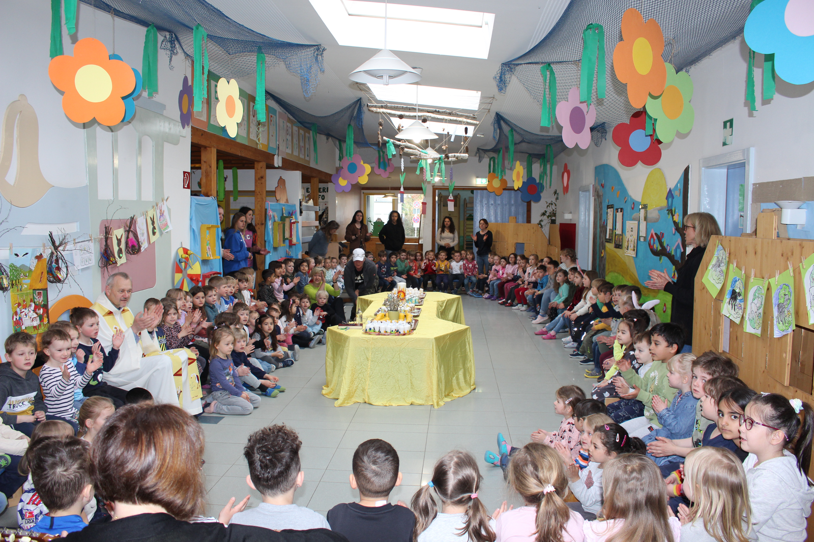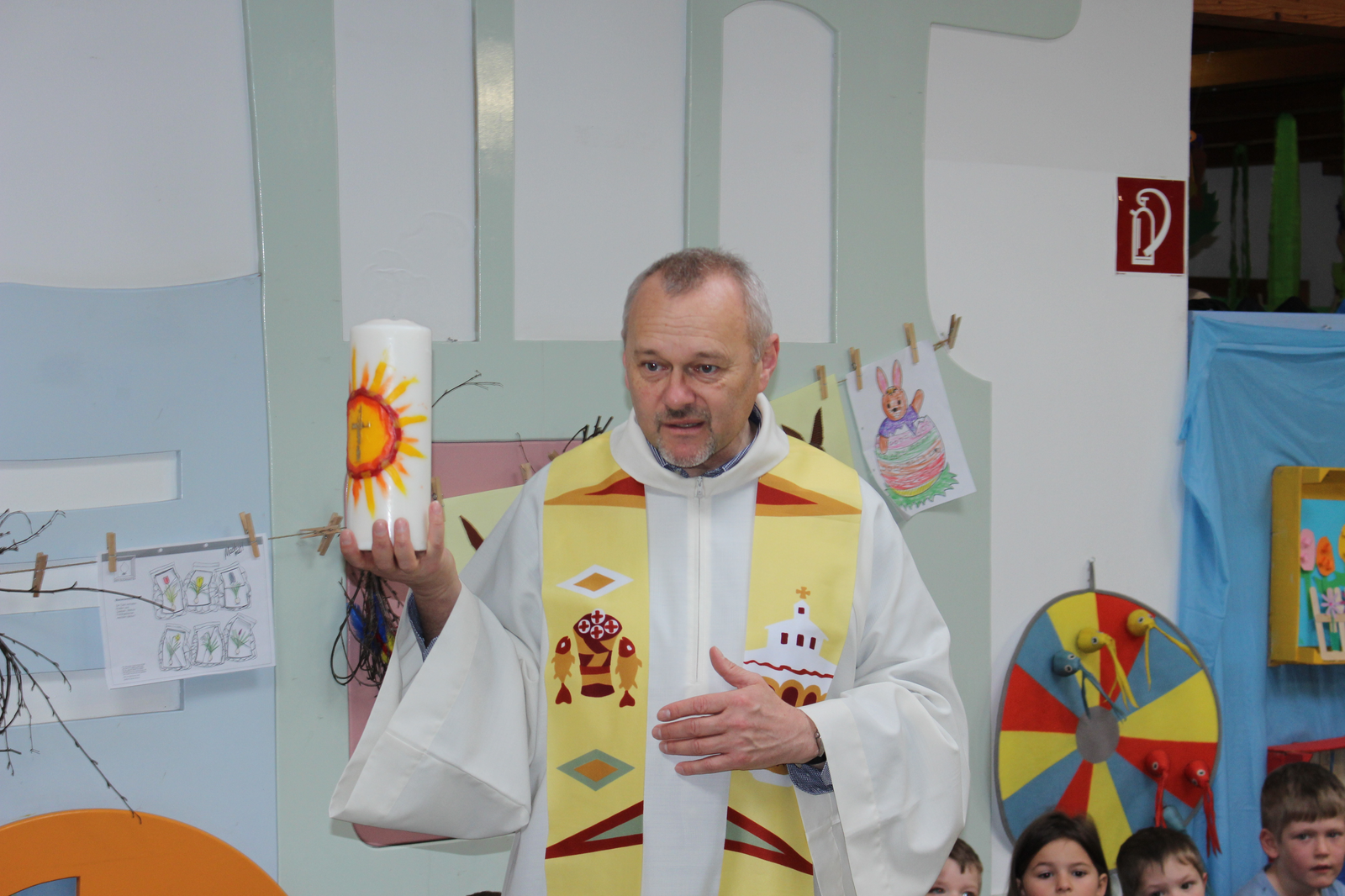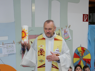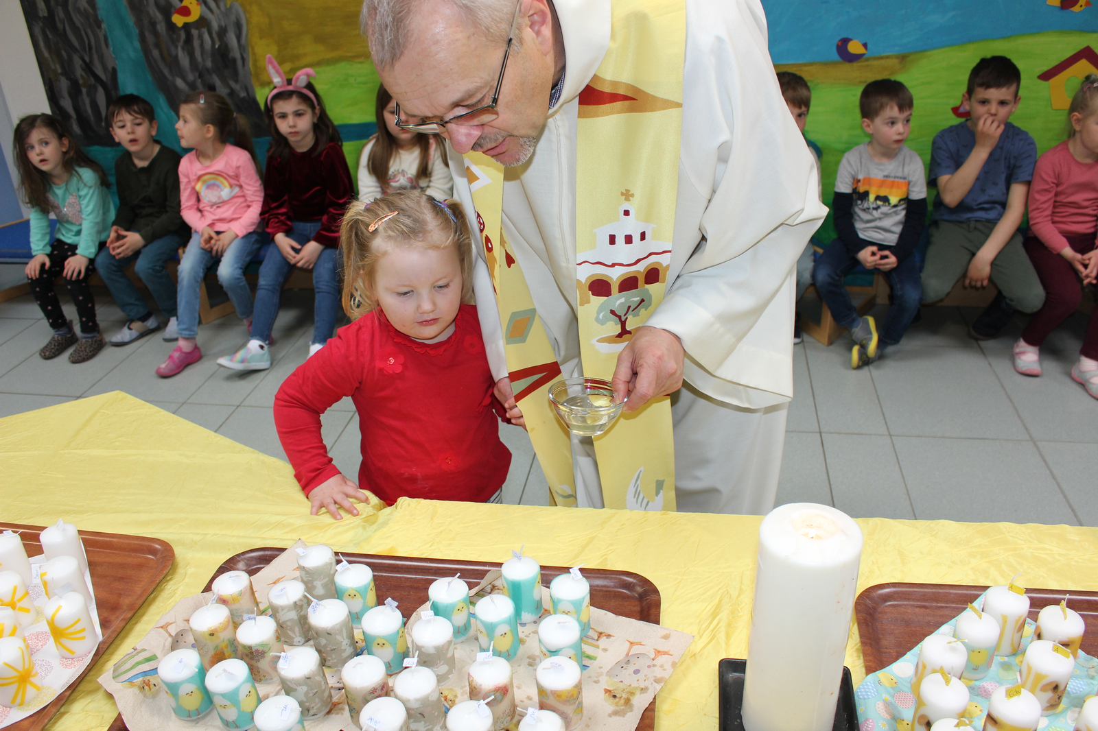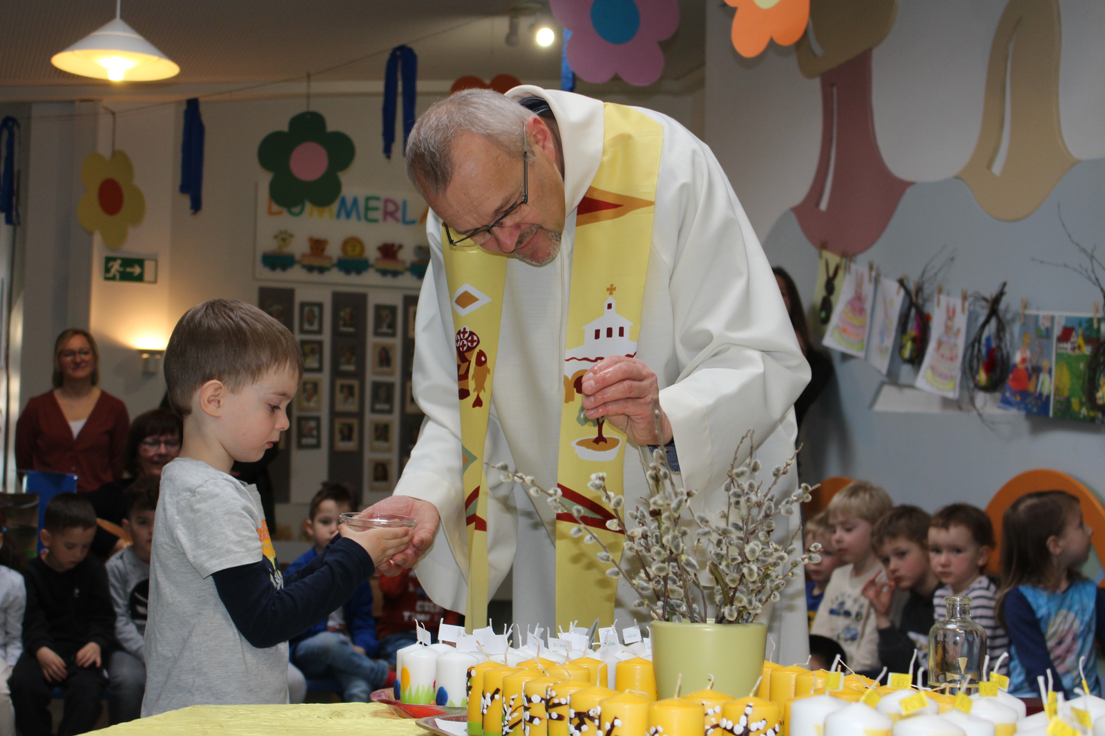 Mucksmäuschenstill war es am heutigen Donnerstagmorgen (30. März 2023) im städtischen Kindergarten „Lummerland“ in Abensberg, als Pfarrer Georg Birner zur Segnung der Osterkerzen gekommen war. Da jedes Kind eine eigene kleine Kerze angefertigt hatte, wurden auch die vielen Kerzchen gesegnet und es wurde das Osterfest und seine christliche Bedeutung angesprochen.