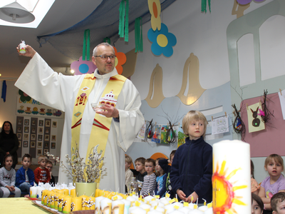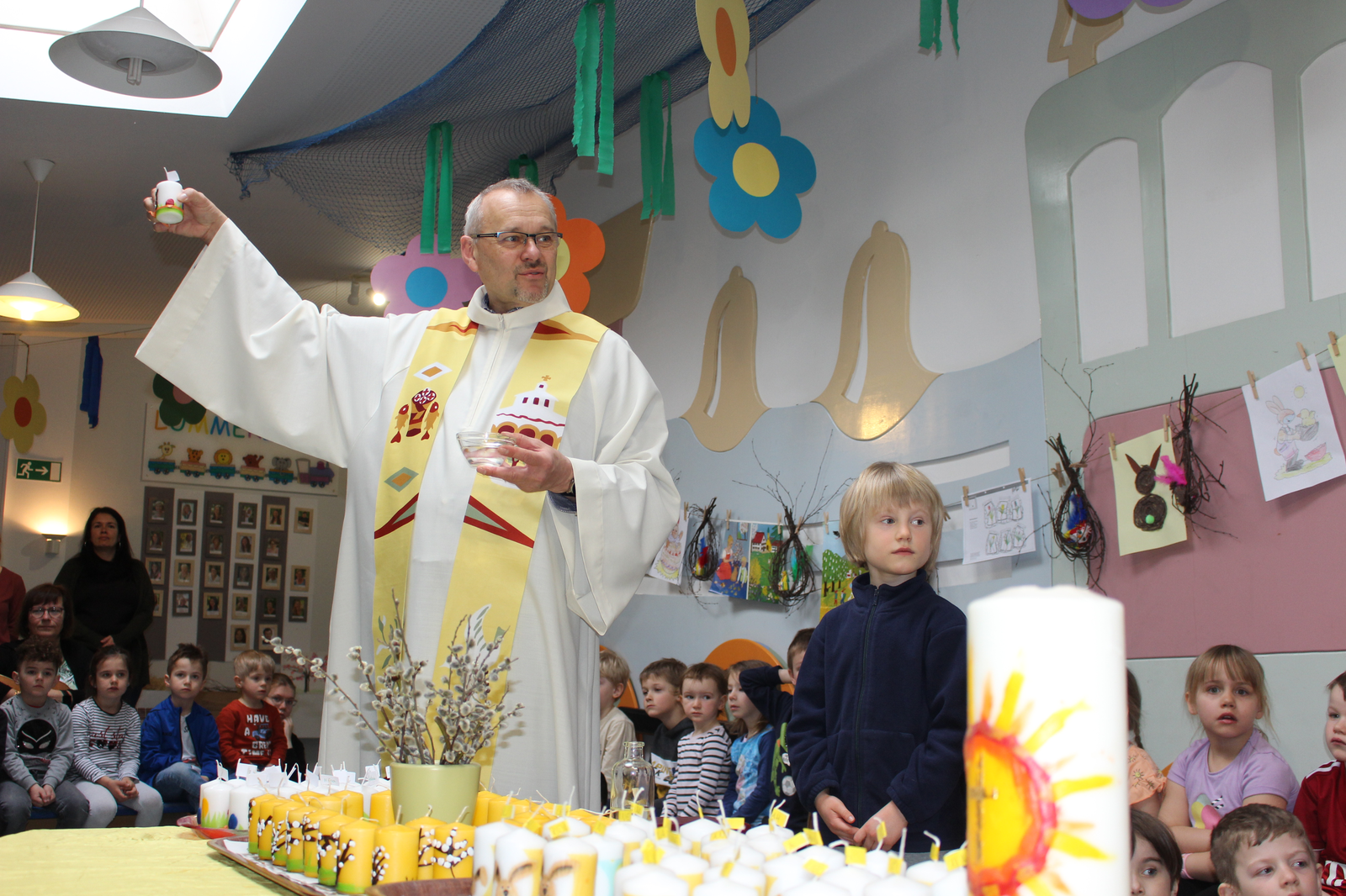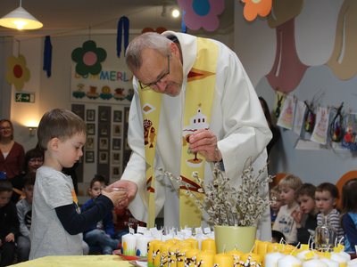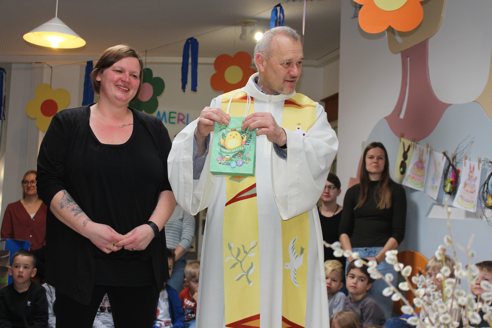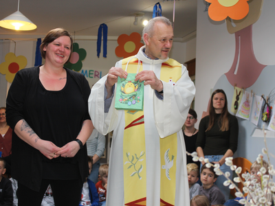 Nach der Segnung wurde Osterbrot für alle ausgeteilt. Und plötzlich kamen auch noch kleine Geschenke zum Vorschein – die hatte ein anonymer Osterhase doch glatt während der Segnung in den Gruppenräumen versteckt. „Lummerland“-Leiterin Cathleen Winkler dankte Pfarrer Birner am Ende der Segnung herzlich für sein Kommen und überreichte ihm ein kleines Osterpräsent.