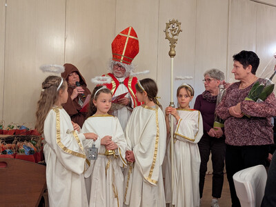 Höhepunkt war sicherlich der Besuch des Nikolauses mit seinem Krampus, im wirklichen Leben Seniorenbeiratsmitglied Hannelore Membarth und ihr Ehemann. Begleitet wurden sie von einer Schar aus Engeln, die in einem vollbeladenen Bollerwagen für jeden Gast ein kleines Geschenk dabeihatten, die sie fleißig an die braven Gäste verteilten.