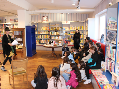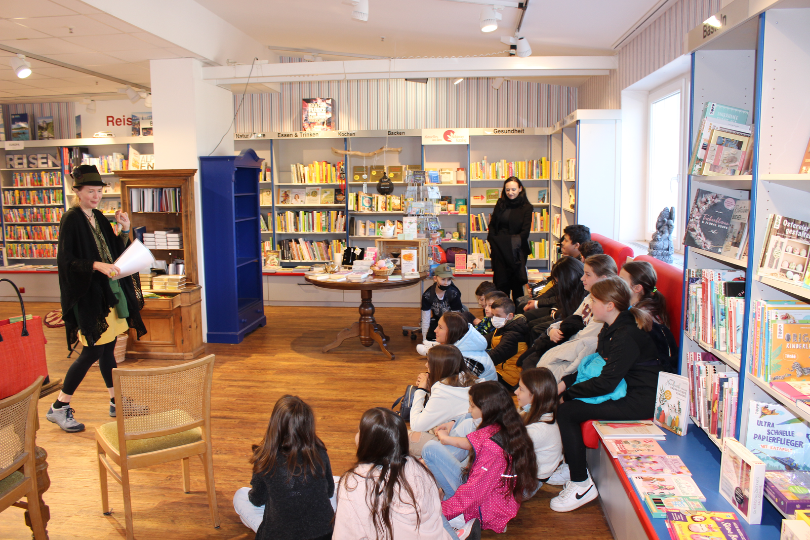 Das Hauptfoto oben entstand in der Buchhandlung Nagel im OG des Einkaufszentrums Abensberg. Links Silke Nagel in Verkleidung, rechts hinten stehend Lehrerin Bettina Sußebach. In der Galerie im ersten Bild der Vorlesestart im EKZ, ebenfalls in Bild 2. Nochmals das Hauptbild.