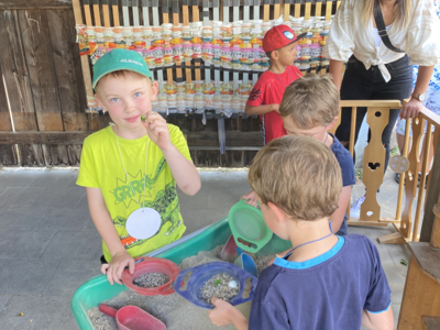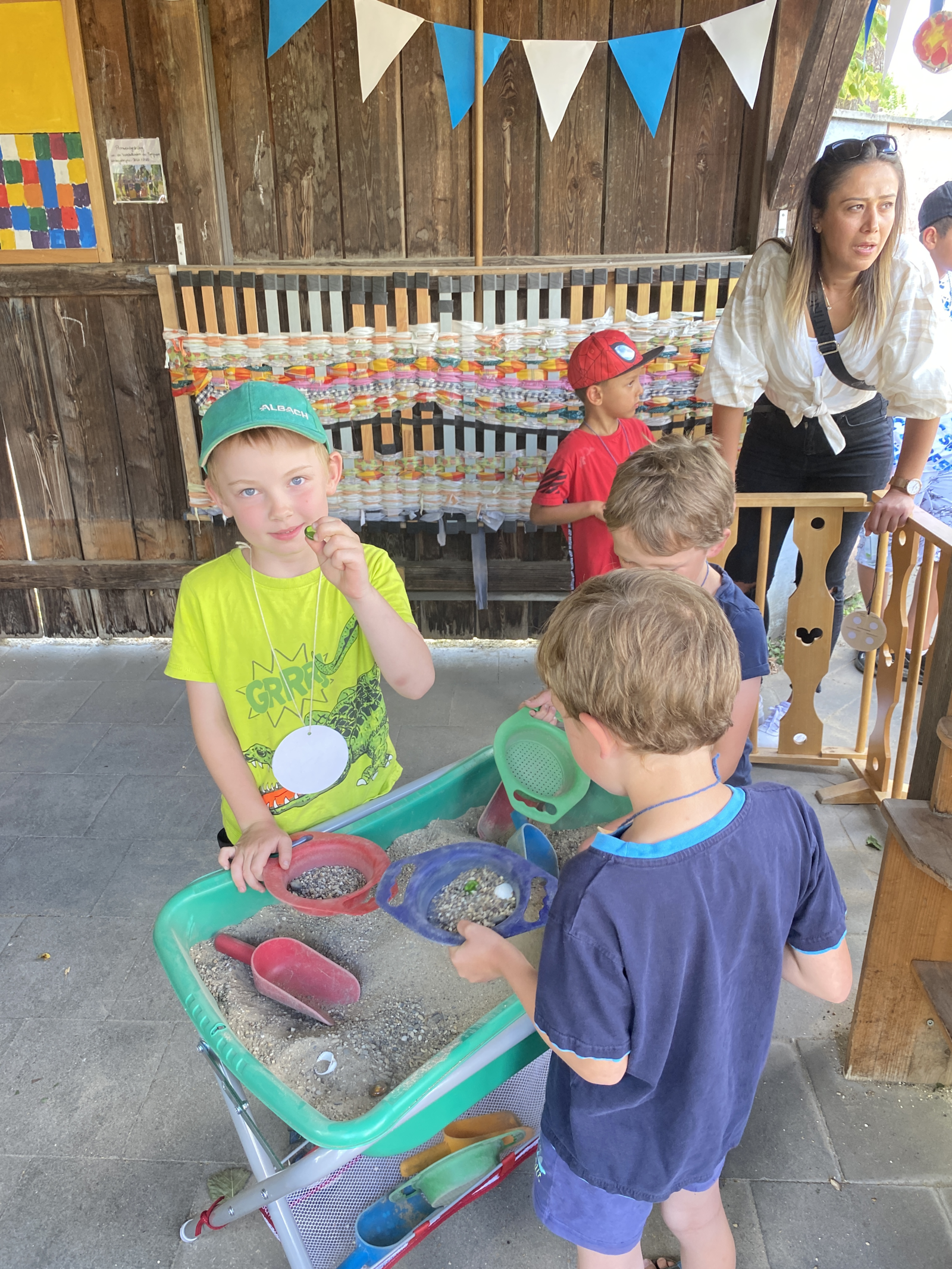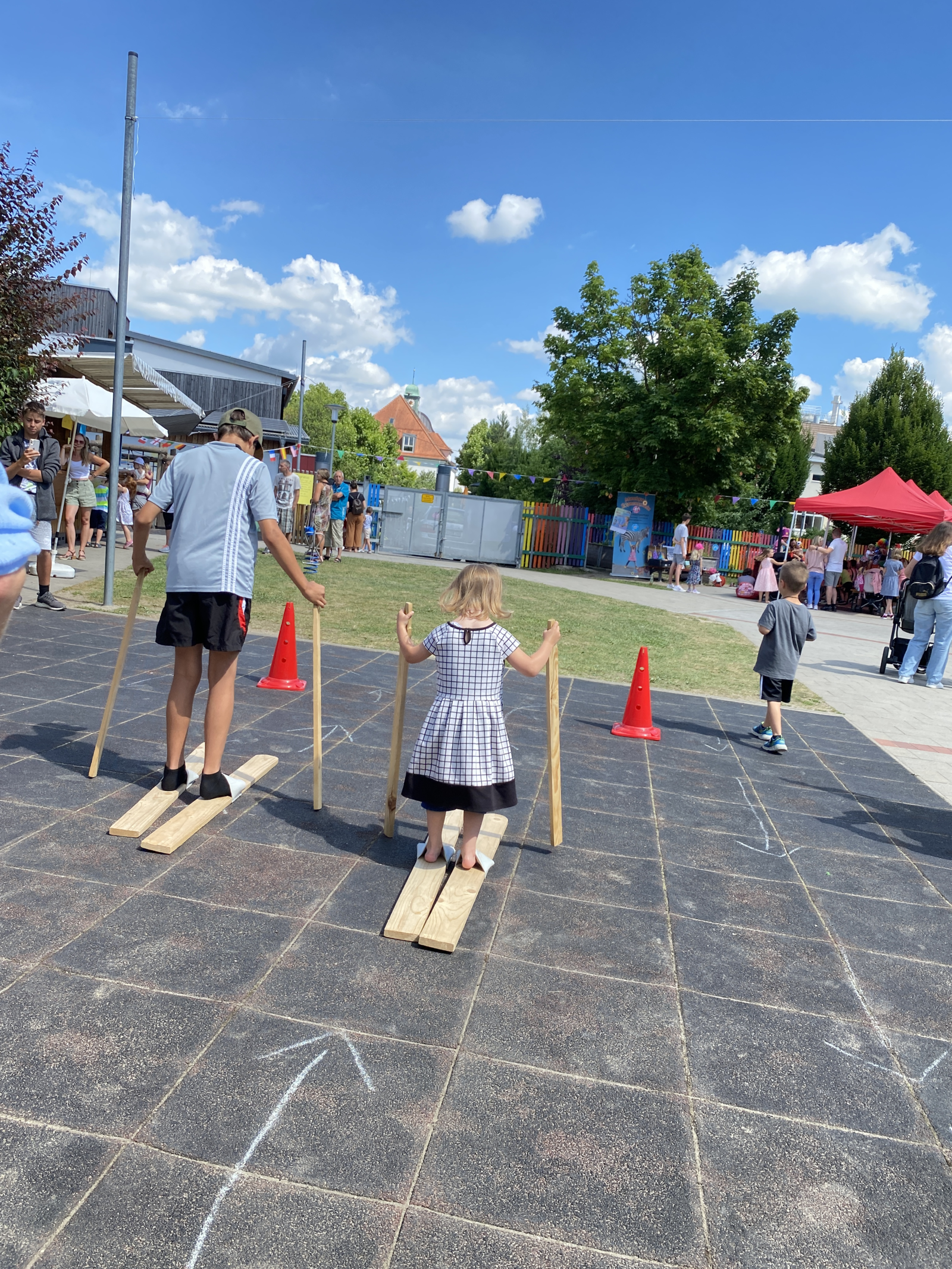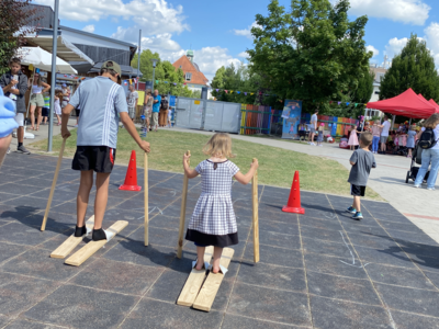 Die Kinder hatten Spaß an verschiedenen Spielstationen – Gummistiefelweitwurf, Skirennen, Sandsieben, Hüpfpferderennen und Nageln – und ein Glücksrad lockte mit vielen tollen Preisen. Der Elternbeirat hat einen Auftritt von Monique Sonnenschein organisiert und finanziert – und der hat sich gelohnt: viele Kinder sagten hinterher, dass ihnen die Spielstationen und das Zaubern mit Monique am meisten Spaß gemacht hätten, so die Kindergartenleiterin. Natürlich gab es auch Speisen und Getränke – Würtslsemmeln, Pommes, Kaffee und Kuchen, Popcorn und Lutscher und, sehr beliebt, Traubenzuckerlippenstifte.