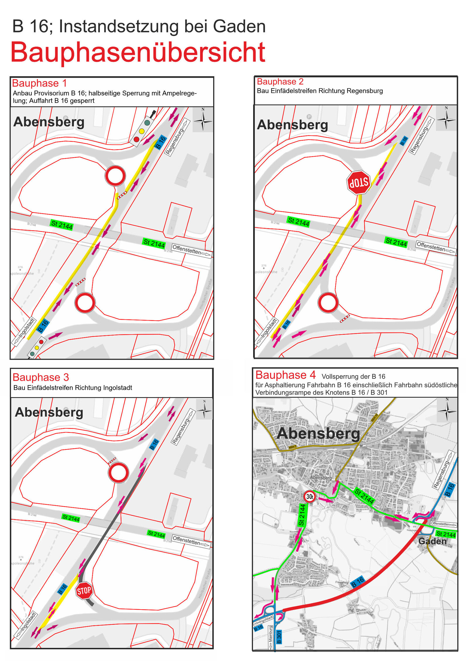 Danach wird in Fahrtrichtung Regensburg der Einfädelstreifen hergestellt. Am Anschluss Gaden-Abensberg ist die Auffahrt von der St 2144 auf die B 16 in Fahrtrichtung Regensburg gesperrt. Nach rund fünf Wochen wechseln die Arbeiten auf die andere Seite: Dann wird in Fahrtrichtung Ingolstadt der Einfädelstreifen gebaut. Nun ist die Auffahrt von der St 2144 auf die B 16 in Fahrtrichtung Ingolstadt gesperrt. Durch die provisorische Verbreiterung steht dem Verkehr auf der B 16 während dieser Zeit für jede Fahrtrichtung eine Fahrspur zur Verfügung. In den Bauphasen zwei und drei werden auch die Parkplätze bei Allersdorf saniert. Sie können in diesem Zeitraum nicht angefahren werden.