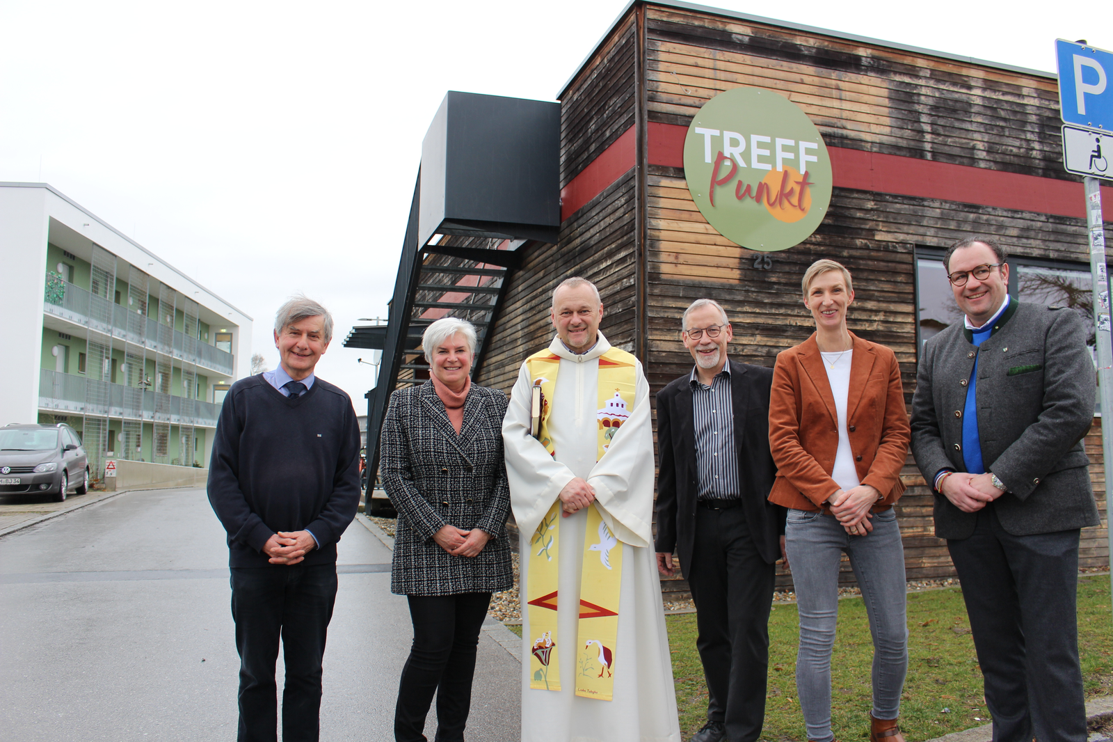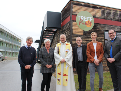 Im Foto oben: Von links Albert Steber, Ursula Prohaska, Pfarrer Georg Birner, 2. Bürgermeister Dr. Heinz Kroiss, Katrin Koller-Ferch und 1. Bürgermeister Dr. Bernhard Resch vor dem ehemaligen Bahnhofskiosk, der jetzt als „TreffPunkt“ für die Bevölkerung zur Verfügung steht.