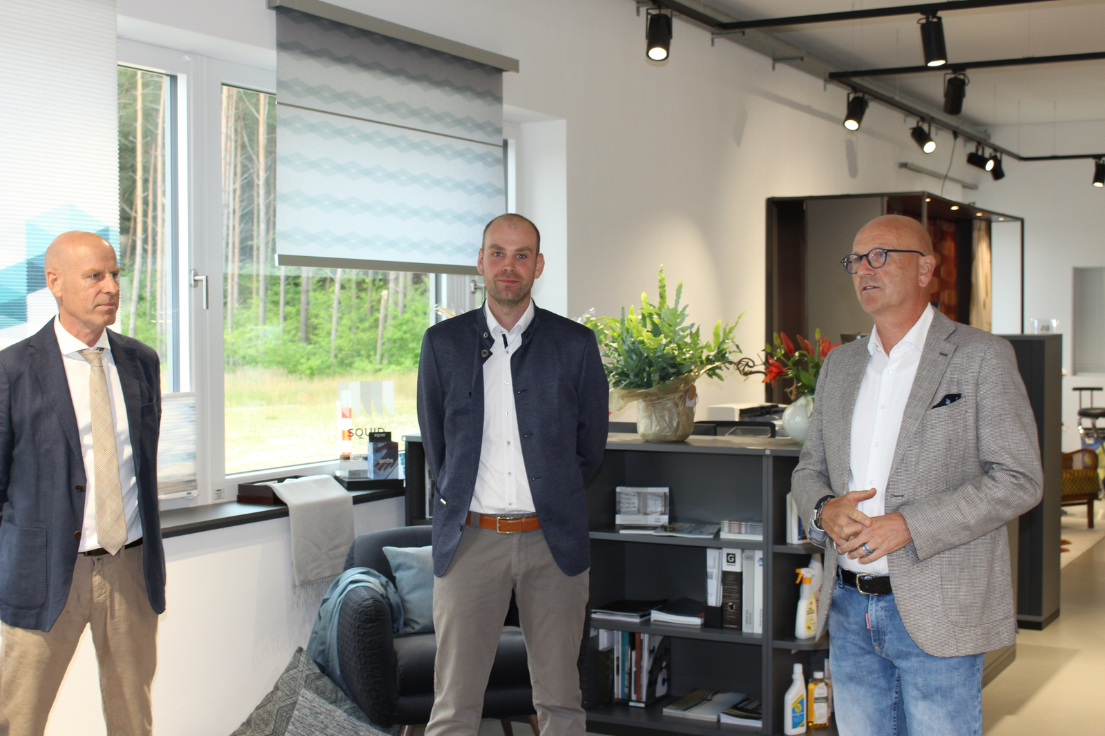 Und der ist aktuell preisgekrönt: Der Neubau auf rund 2.700 Quadratmetern Fläche wurde vom Fachmagazin „Heimtex“ als bundesweiter „Vorbildlicher Neubau des Jahres 2022“ ausgezeichnet – wer die Ausstellung besucht, dem wird schnell klar, warum: stilvoll und lichtdurchflutet wird das Sortiment präsentiert. Auf einem Freiluftareal sind auf 250 qm Markisen und Pergolen ausgestellt, Gartenmöbel und Outdoor-Bodenbeläge ebenfalls. Eine Blumenwiese in der Hofmitte sorgt für einen kunterbunten Blickfang, Bienenstock, Insektenhotel und Hühner gehören mit dazu. Eine regenerative Heizung mit Brennstoffzelle ist verbaut und eine Tankstelle für E-Fahrzeuge sowie PV-Anlagen sind vorgesehen. Parkplätze sind rundum vorhanden.