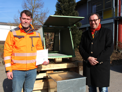 Im Foto Andreas Ganslmayer (li.) mit Urkunde und mit Bürgermeister Dr. Bernhard Resch vor der Lebendfalle. Foto: Knott