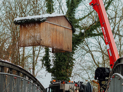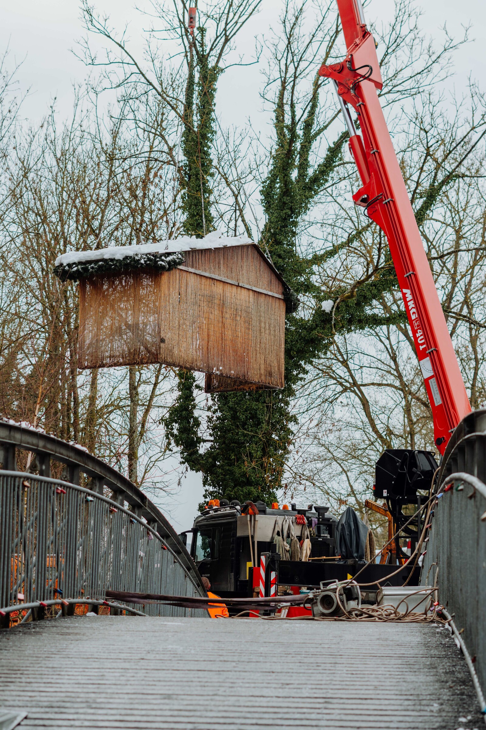 Am heutigen Freitag, 08.12.2023, wurde die Krippe wieder ans Ufer befördert und mithilfe des großen Krans aus dem Wasser gehoben. Ein großes Dankeschön geht hierbei an das gesamte Bauhof-Team der Stadt Abensberg und an Faltermeier Kranarbeiten für die kurzfristig anberaumte Unterstützung.