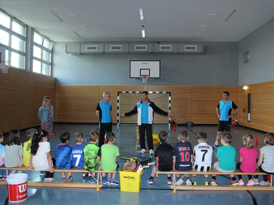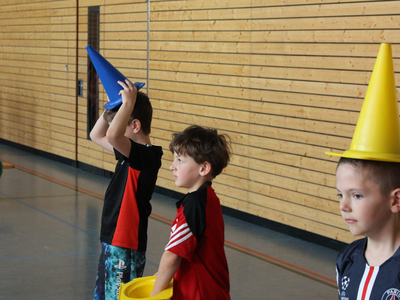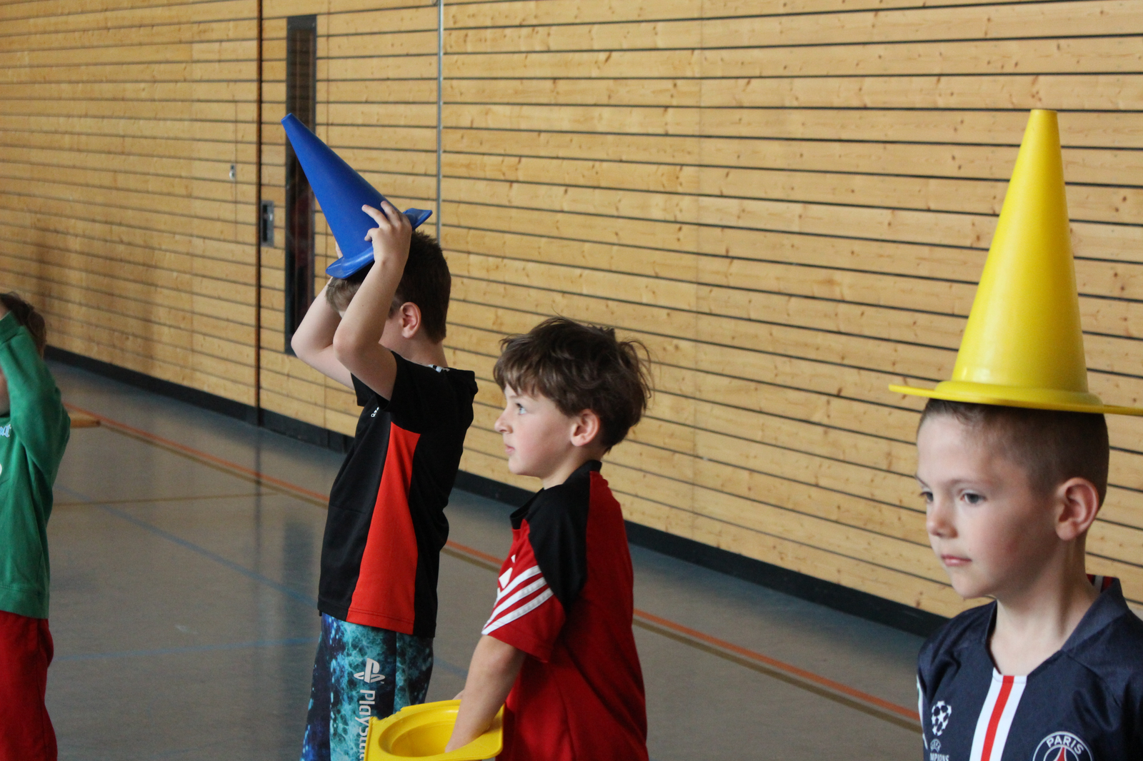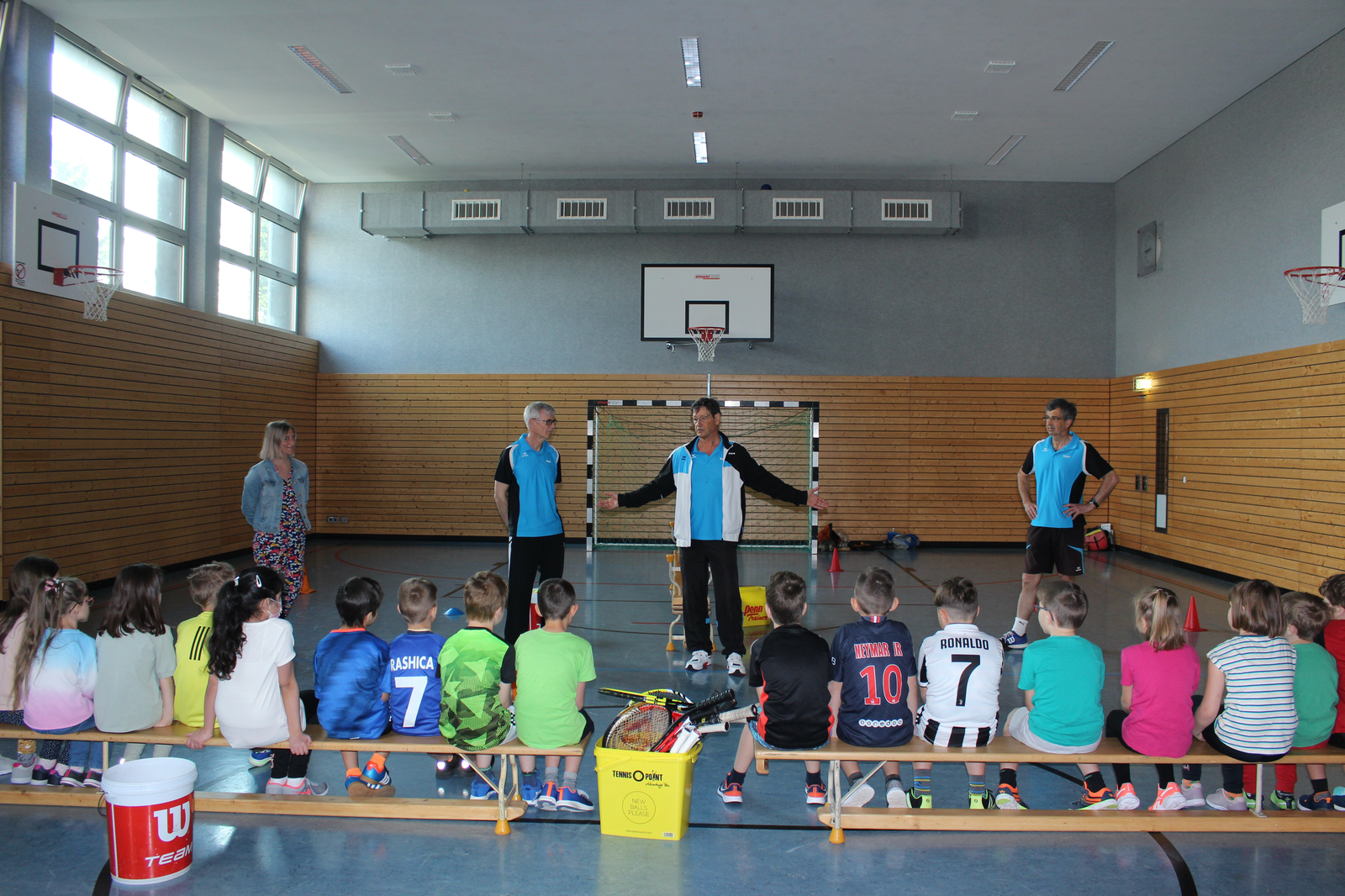 Ein Tennisspieler des TSV Abensberg informierte kurz über den Ablauf. Die Klassen wurden auf zwei Gruppen aufgeteilt für jeweils eine Hallenhälfte. Die beiden Gruppen starteten nun parallel zum Aufwärmen mit der obligatorischen Laufrunde in der Sporthalle. Garniert wurden diese Runden z.B. mit Slalom um Hütchen, Dehnübungen und weiteren Varianten an Übungen.