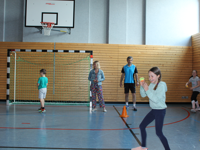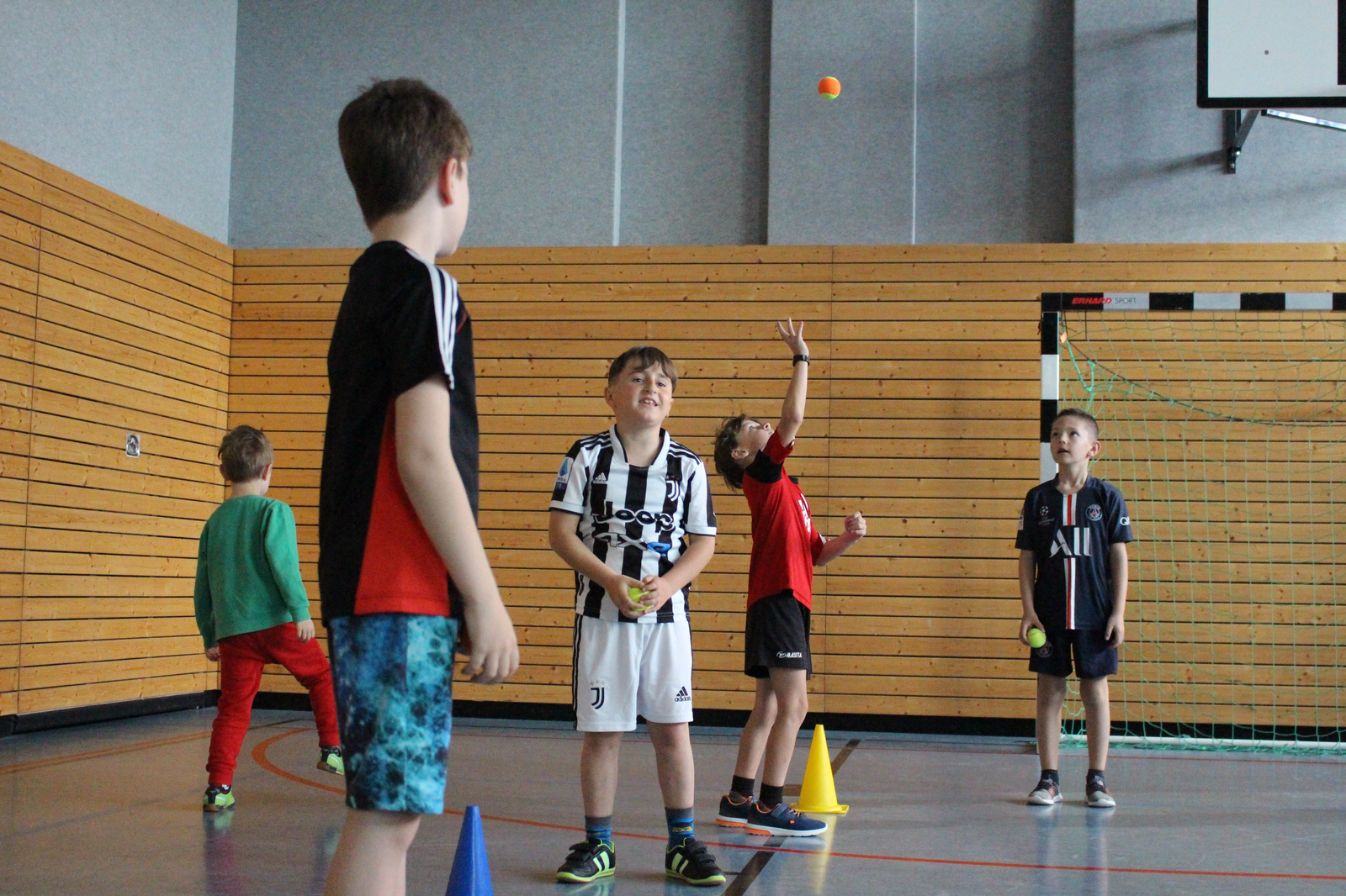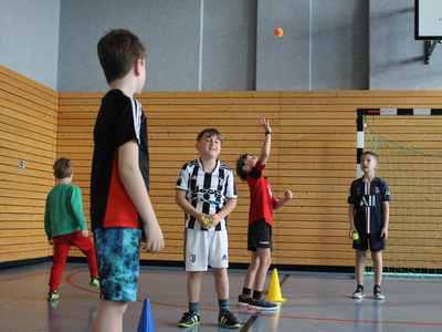 Bei der nächsten Aufgabe kam dann auch schon der Tennisball ins Spiel. Die Kinder der einen Gruppe mussten den Tennisball prellen, fangen und gegenseitig zuwerfen. Als nächstes warf jeweils ein Kind einen Tennisball und ein anderes Kind musste diesen mit einem Hütchen fangen. In der anderen Gruppe wurde den Kindern das Handling des Tennisschlägers gezeigt. Anschließend musste unter Anleitung jedes Kind mit dem Tennisschläger einige Bälle über zwei übereinander gestellte Sitzbänke befördern, welche das Tennisnetz darstellten. Dies stellte für einige eine große Herausforderung dar – für die Kinder auf der anderen Seite des Netzes hingegen war es eine riesige Gaudi. Denn dort durften die Mädchen und Jungen die kleinen, gelben Flugobjekte auffangen. Nach anschließendem Seitentausch der Gruppen wurden die Übungen wiederholt.