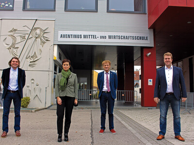 Im Foto oben von links Christian Lanzl, Karin Köglmeier, Wolfgang Brey und Martin Schweiger vor der Aventinus Mittelschule und Staatlichen Wirtschaftsschule Abensberg.