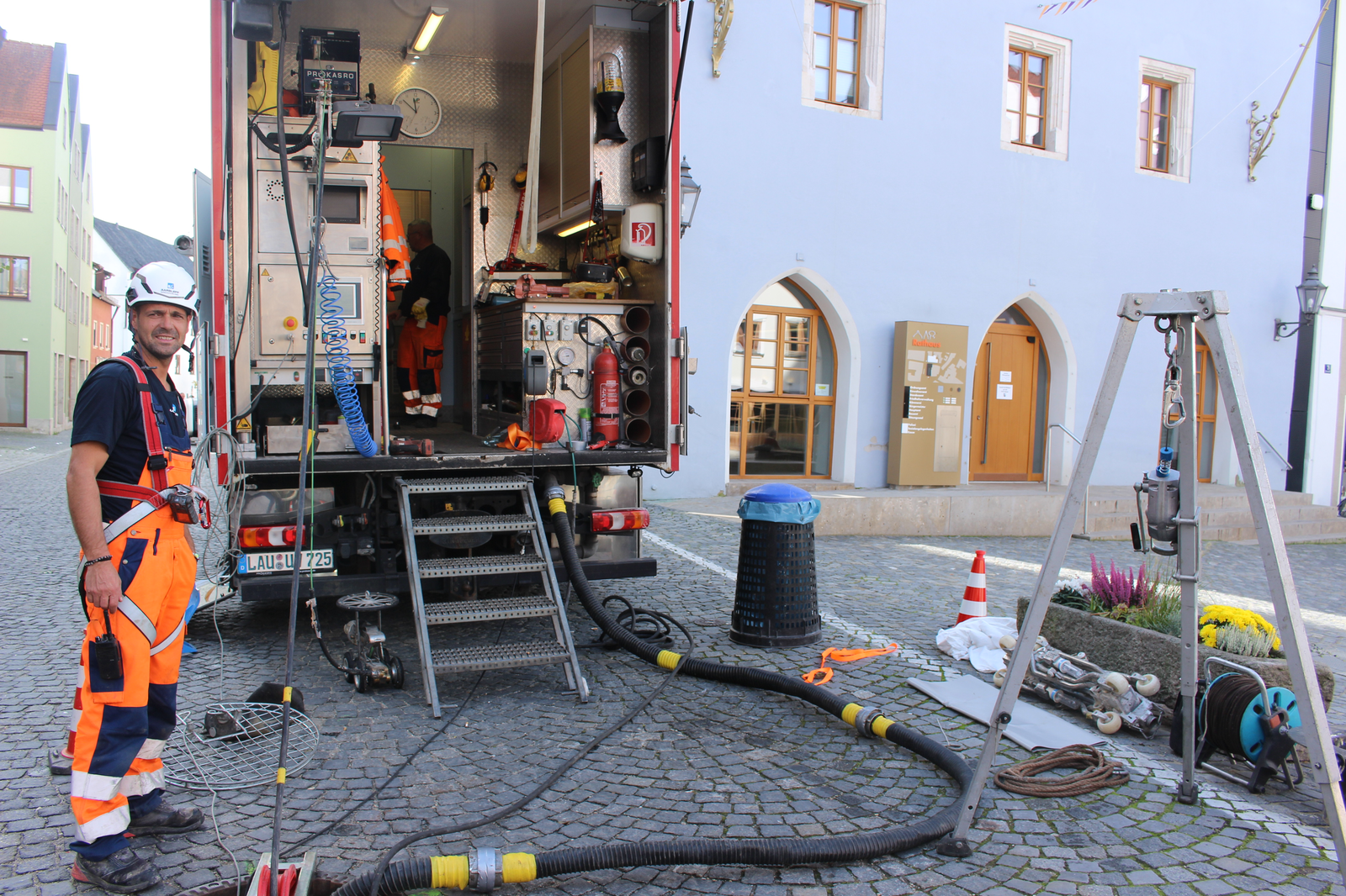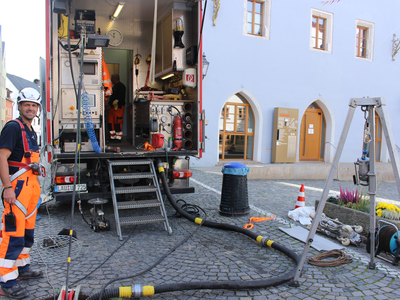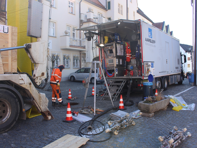 Abgeschlossen sind mittlerweile die Kanalsanierungen am Stadtplatz und in der südlichen Innenstadt. Dabei wurde von einer Fachfirma ein modernes Verfahren angewendet, das sogenannte Schlauchlining: Kunststoff-Schläuche werden durch einen Kanalabschnitt gezogen, aufgepumpt und ausgehärtet. Das ist eine günstigere Lösung, als neue Rohre einzubauen – und erheblich schneller.