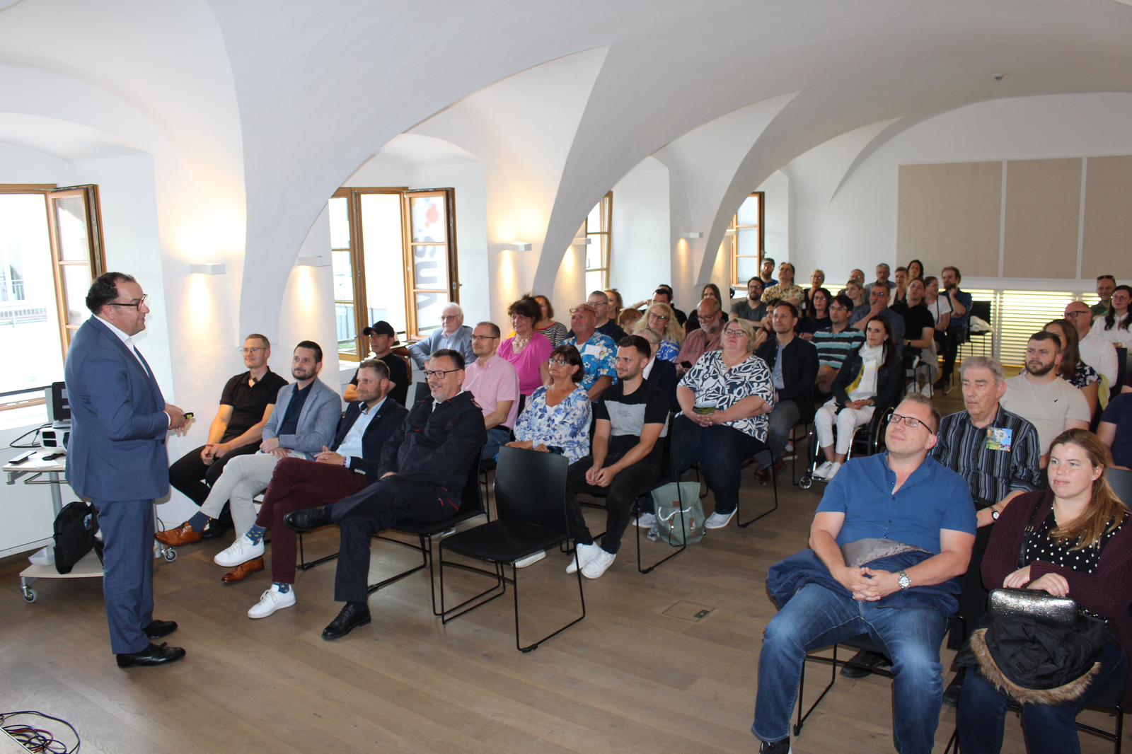 Mit dem Lied „One fine day“ eröffnete der Abensberger Chor „Stimmix“ mitreißend den Neubürgerempfang der Stadt Abensberg, der am Montagabend (10. Juni 2024) im Aventinum stattfand. Eingeladen wurden von der Stadtverwaltung alle Bürgerinnen und Bürger, die vom 1. Mai 2023 bis zum 30. April 2024 nach Abensberg gezogen sind – das waren 20 Ehepaare, 405 Einzelpersonen und 35 Familien; gekommen waren schließlich rund 70 Interessierte, die vom 1. Bürgermeister Dr. Bernhard Resch herzlich begrüßt und durch den Abend geleitet wurden. Die Neubürgerbegrüßung hat in Abensberg seit vielen Jahren Tradition; Mitarbeiter der Verwaltung und Personen des öffentlichen Lebens geben sich dabei ein Stelldichein und informieren die neuen Mitbürgerinnen und Mitbürger über Abensberg. Auch kleine Präsente werden dabei vergeben und die Werbegemeinschaft verlost noch am selben Abend Einkaufsgutscheine.