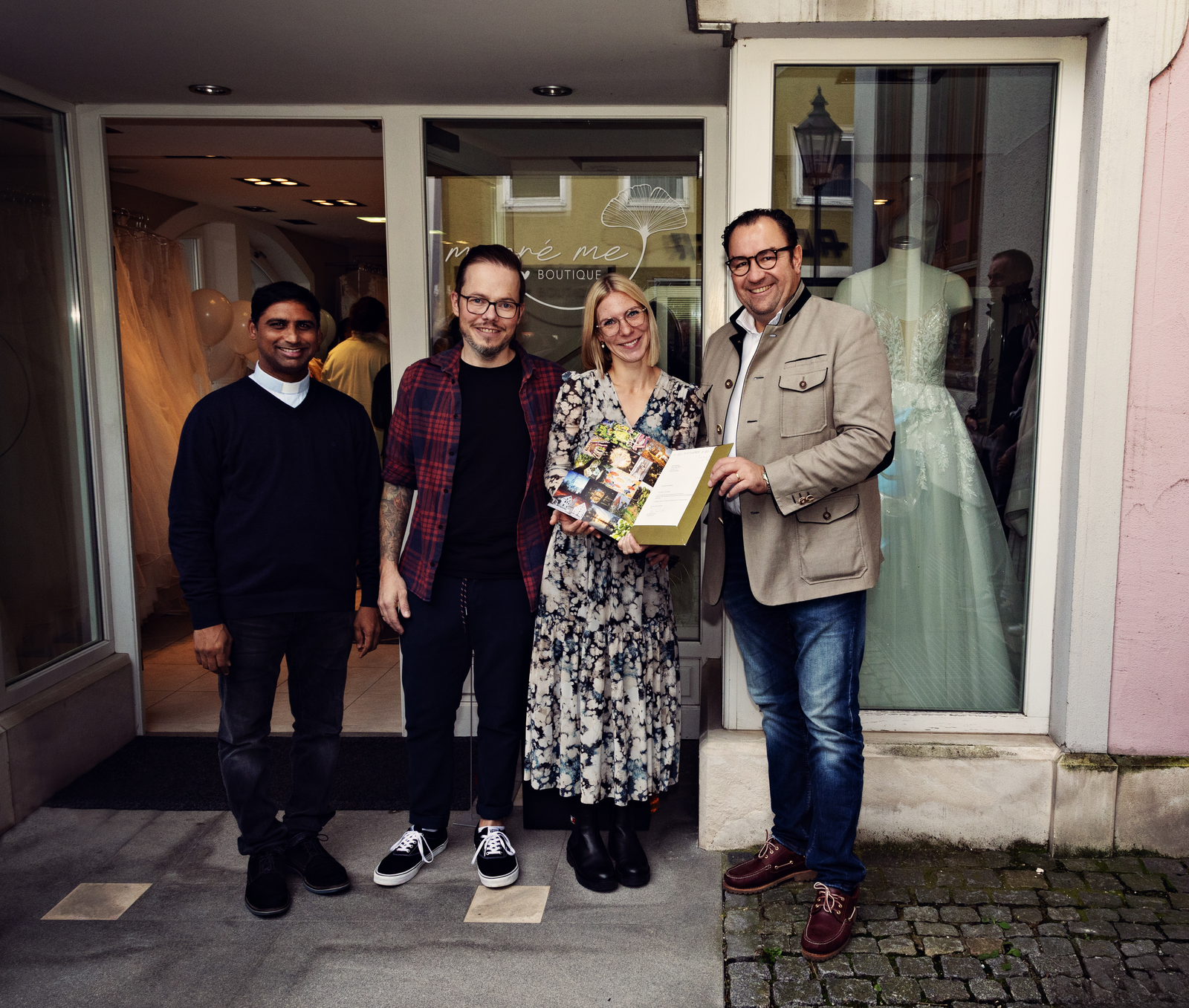 Im Hauptbild oben von links nach rechts: Kaplan Velangini Reddy Nagireddy, Ben und Corina Marré und 1. Bürgermeister Dr. Bernhard Resch. In der Galerie Frau Marré in den neuen Räumen in der Ulrichstraße 24 und weitere Bilder, danach nochmals das Hauptfoto. Text: Ingo Knott. Fotos: Picscouture Photography.