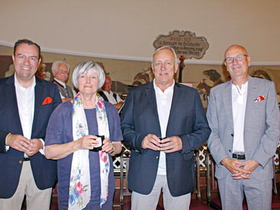 Noch nicht bekannt waren der Öffentlichkeit die Ehrungen des Jahres 2021. Helmut Barsa hat die Silberne Verdienstmedaille erhalten. Er ist seit über 40 Jahren im Stadtverband aktiv – seit 1977 als Fotograf, seit 1984 als Kassier und Schatzmeister. „Unter dem Stadtverbands-Motor Hans Leidl bist Du über 40 Jahre aktiv“, so Dr. Brandl. Und für einen Abensberger fast eine Strafe: „Immer nüchtern bleiben auf dem Gillamoos, weil sonst die Bilder verwackeln.“ Ebenfalls eine Silberne Verdienstmedaille hat Almut Fuchs-Hofer 2021 erhalten. Auch sie ist seit den 80er Jahren beim Stadtverband aktiv, seit 1991 Beisitzerin, seit 2016 Schriftführerin. Sie engagiert sich in der evangelischen Kirchengemeinde und ist Fair Trade-Aktivitäten der Abensberger Lenkungsgruppe stets dabei. „Du beherrschst es, Kritik zu üben, ohne zu beleidigen“, so Dr. Brandl. Eine Silberne Verdienstmedaille 2021 wurde beim Ehrenabend auch an Reinhard Oberhofer verliehen. Er ist bei verschiedenen Vereinen und Veranstaltungen tatkräftig mit dabei und durch sein handwerkliches Geschick und gute Ideen „eine Bereicherung im Dorfleben“, so Dr. Brandl. Beim OGV Staubing/Holzharlanden ist er seit 2004 aktiv dabei, im Feuerwehrverein Holzharlanden ist er seit 2003 Kassier, war Mitglied im Festausschuss zum 125-jährigen Jubiläum und bei der Freiwilligen Feuerwehr ist er als aktives Mitglied bei Übungen und Einsätzen dabei. Er sei – auch im Hinblick auf die Auswirkungen der Gebietsreform – „eine Integrationsfigur“, so der Bürgermeister. (Bild 1 der Galerie, mit dabei die Preisträger der Silbernen Verdienstmedaille 2020.)