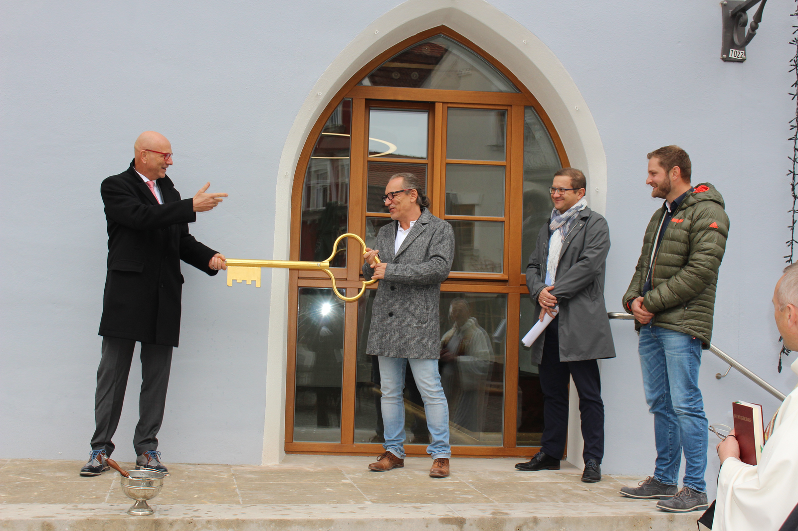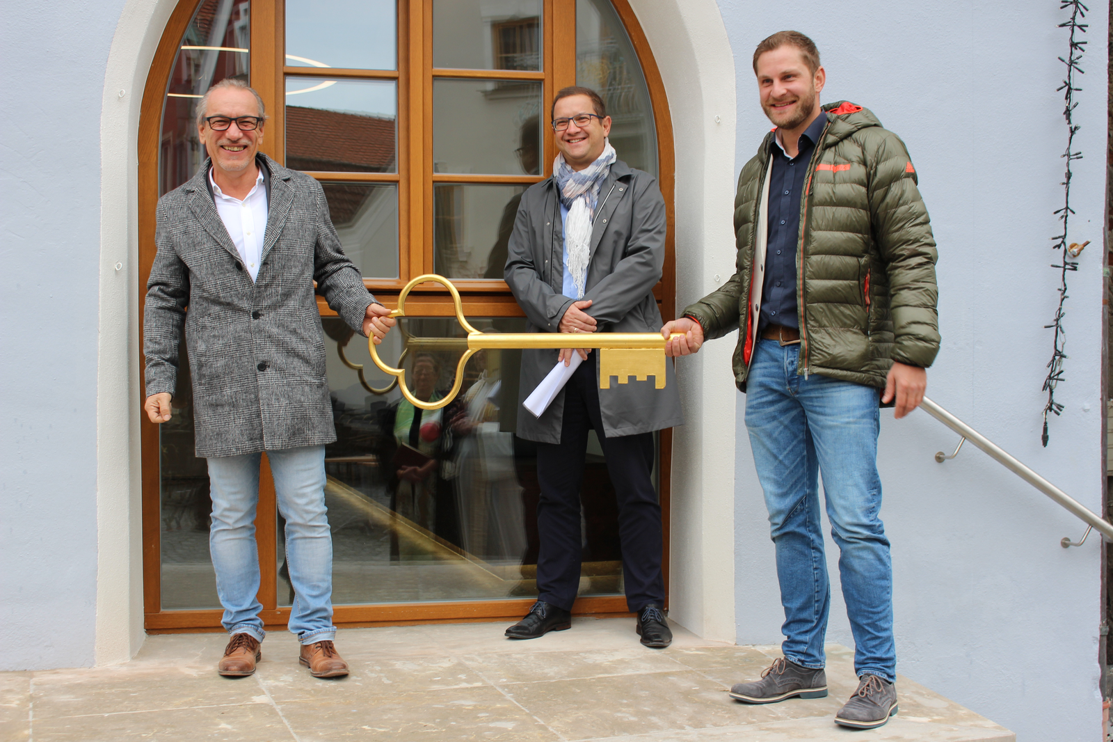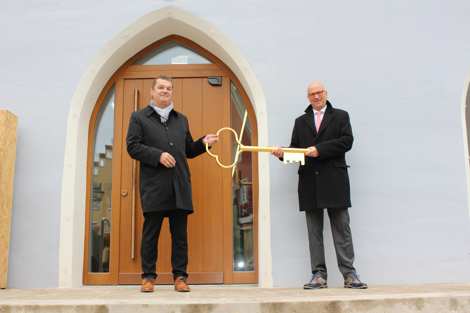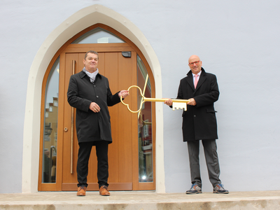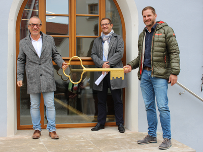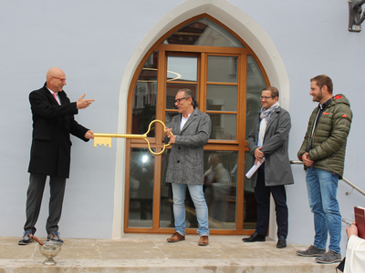 Mit der Schlüsselübergabe von Architekt Norbert Raith an Abensbergs 1. Bürgermeister Dr. Uwe Brandl vor dem neuen Haupteingang des Abensberger Rathauses hat ein großes, von einigen Unwägbarkeiten gezeichnetes Bauprojekt sein Ende genommen. Die Stadtverwaltung Abensberg freut sich, wieder im Herz der Stadt für die Bürgerinnen und Bürger zur Verfügung zu stehen.