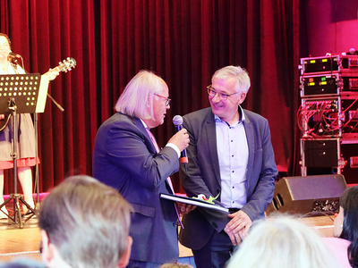 Am Schluss gab es stehende Ovationen für einen von der Abschiedsfeier sehr berührten Johannes Paintl. „Ich habe natürlich einen Wunsch an euch alle“, unterstrich er, „ich wünsche euch allen, die mir 29 Jahre Treue, treue Freundschaft gegeben haben – denn es war wirklich ein Vergnügen diese 29 Jahre, ich wünsche euch allen vor allem eines“, sagte er und hielt einen Smiley-Button in die Höhe. „Das hier – dass ihr immer ein Lächeln habt, denn wenn ihr so lächeln könnt, dann seid ihr zufrieden – das wünsche ich euch! Immer und ewig Zufriedenheit.“