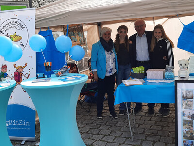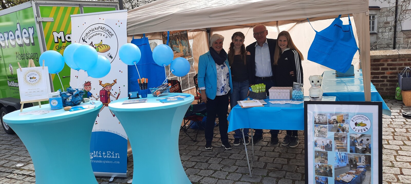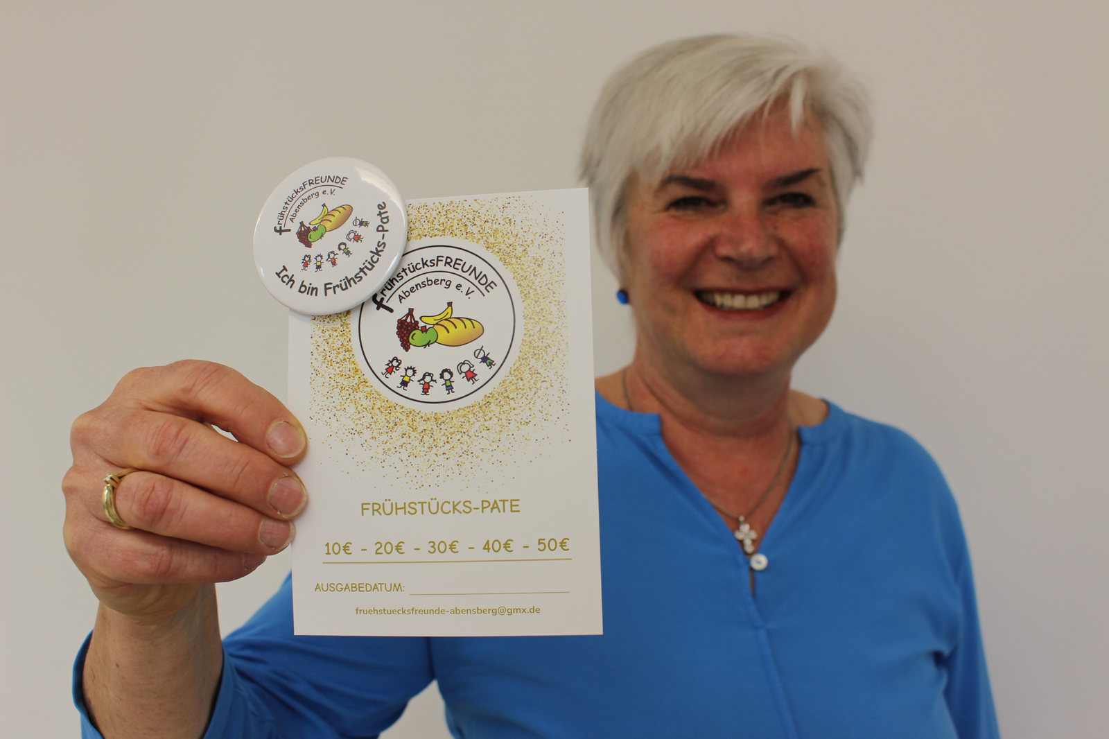 Im Bild oben hält die Vorsitzende eine Frühstücks-Patenschafts-Postkarte in die Kamera. Auch Buttons gibt es inzwischen (mit im Bild; Foto: Knott). In der Galerie Ursula und Karl Prohaska mit ihren beiden Enkelkindern am Stand auf dem Frühjahrsmarkt 2025 in Abensberg. (Foto: Prohaska.) Im nächsten Bild die Glückskekse (Foto: Knott), dann das erneuerte Logo und nochmals das Hauptmotiv.