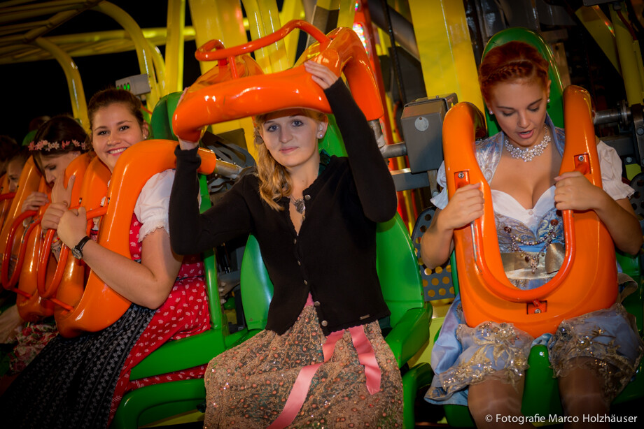 Kandidatinnen der Dirndlköniginnenwahl mit Festwirt Peter Schönigier und Niklas Neumeyer.