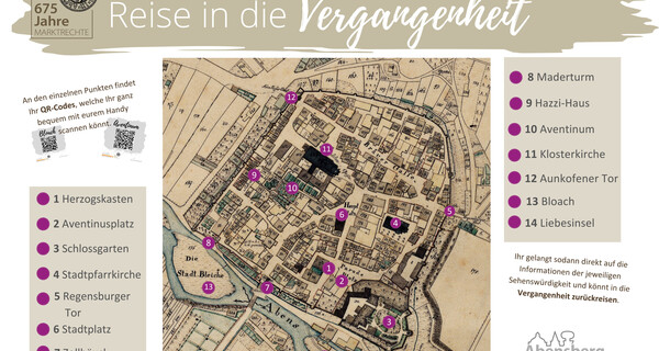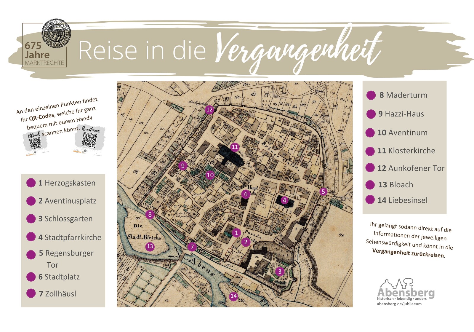 Tauchen Sie ein in eine Reise in die Vergangenheit! Wie hat Abensberg früher ausgesehen und was wurde hier früher gemacht? An den einzelnen Sehenswürdigkeiten finden Sie, wie hier unten abgebildet, QR-Codes mit denen Sie direkt auf die Erläuterungen und historischen Bilder zugreifen können.