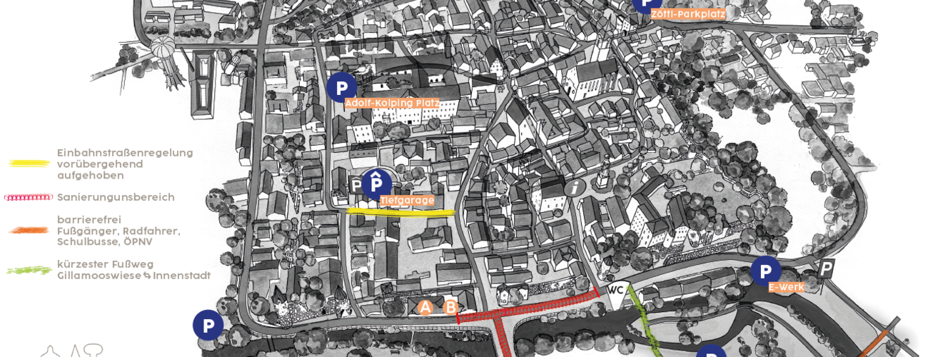 Nutzen Sie den Großparkplatz auf der Gillamooswiese in der Münchener Straße, er ist nur ein paar Minuten von der Innenstadt entfernt.