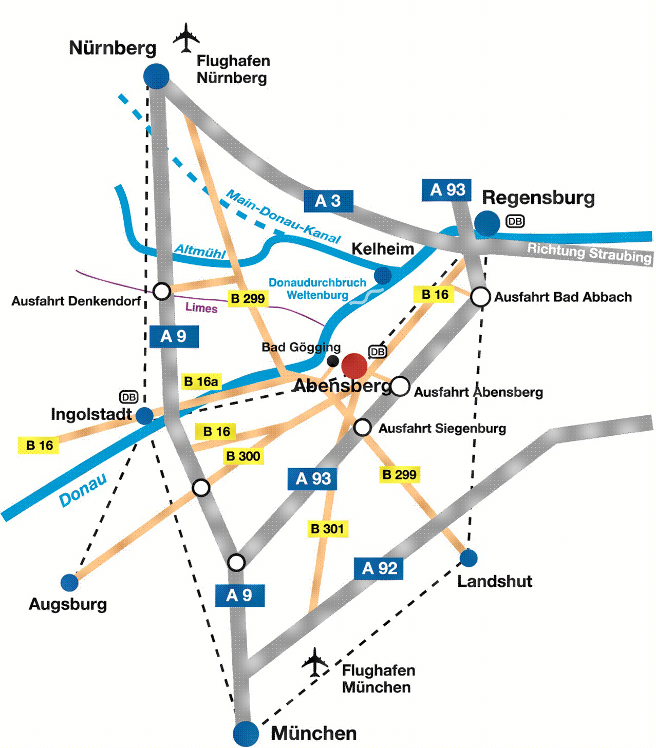 Abensberg liegt an der Bahnstrecke Regensburg - Ingolstadt. Der Bahnhof ist ca. 5 Gehminuten von der Altstadt entfernt. Linktext. Fahrplanauskunft
